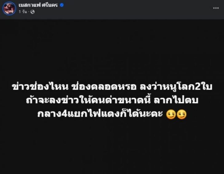 ล่าสุดสาว “เนสกาแฟ” ไม่ขอทน ออกมาฟาดเดือดว่า “ข่าวช่องไหน ช่องคลอดหรอ ลงว่าหนูโลก2ใบ ถ้าจะลงข่าวให้คนด่าขนาดนี้ ลากไปตบกลาง4แยกไฟแดงก็ได้นะคะ” พร้อมบอกอีกว่า “พี่คือบ่ลากหนูไปตบกลาง4แยกโลด พาดหัวข่าวแหมะ”