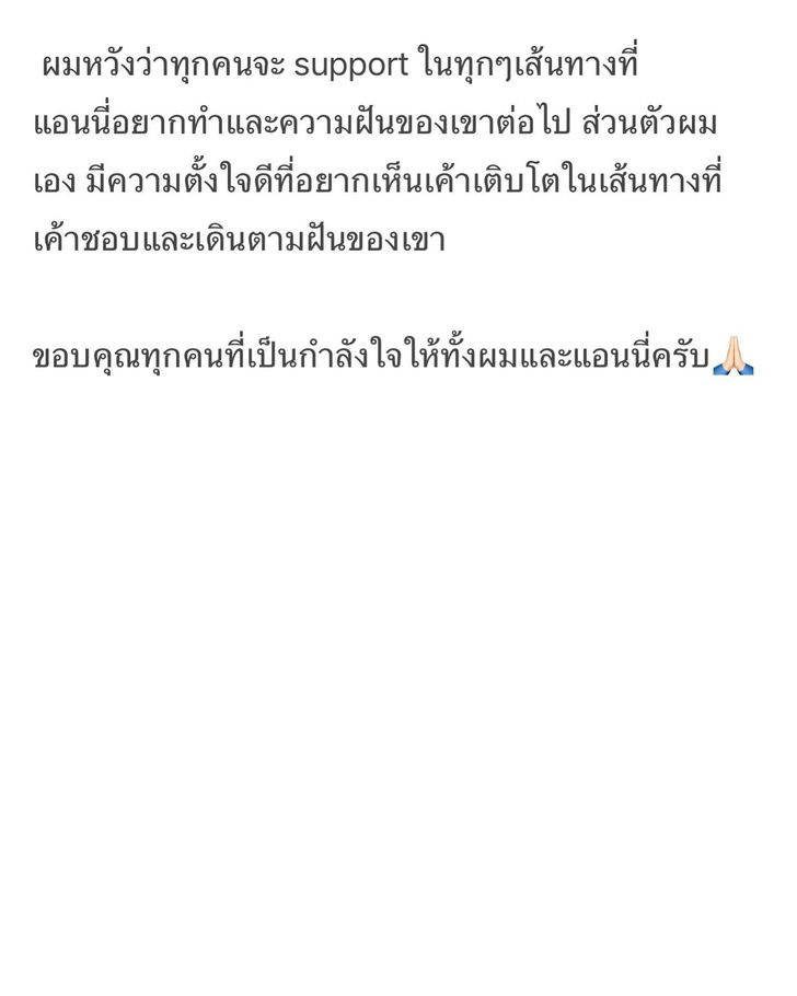 ผมอยากจะบอกกับทุกคนที่รักและ support เราทั้งสองคนว่าถึงแม้ผมกับแอนนี่จะเลิกกัน แต่เป็นการเลิกกันด้วยดี เราทั้งคู่ได้พยายามแก้ไข และปรับจูนในความสัมพันธ์กันมาตลอด แต่ถึงแม้เราจะเลิกกันไป ตัวผมก็ยังห่วงใย หวังดี และยังคอยสนับสนุนให้เค้าได้รับโอกาสที่ดี แม้ว่าเราจะเลิกรากันไปแล้ว แต่มันยังมีความทรงจำดีดีที่ผมรู้สึกขอบคุณ และเรายังเป็นพี่น้อง เป็นเพื่อนที่ดีต่อกัน และ support กันแม้ว่าจะไม่ได้อยู่ในสถานะแฟนอีกต่อไป