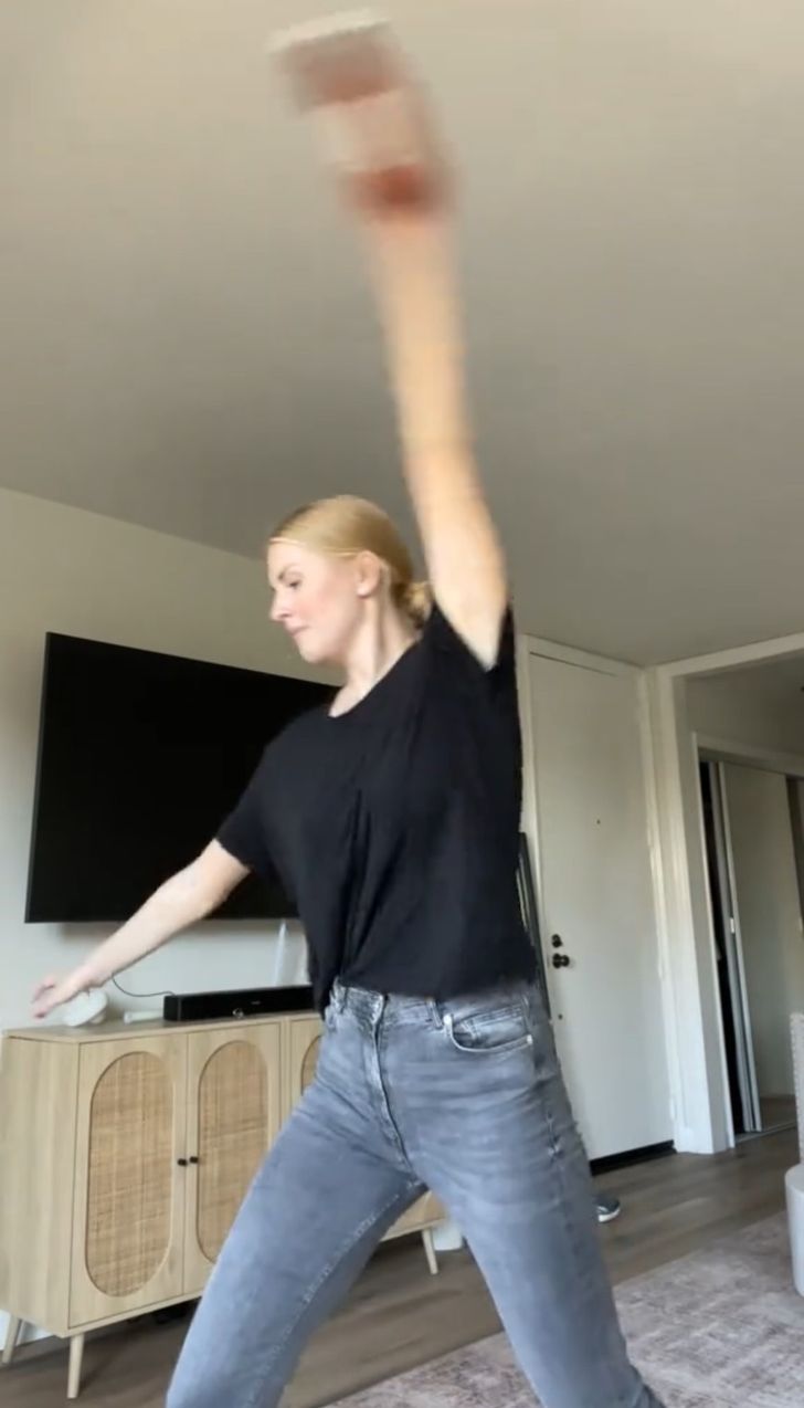 จากนั้นเธอหยิบก้นขวดซอสมะเขือเทศมาถือ แล้วหมุนแขนอย่างรวดเร็ว 7 ครั้ง และแน่นอนว่าซอสมะเขือเทศทั้งหมดกระจุกตัวอยู่ใกล้ปากขวด