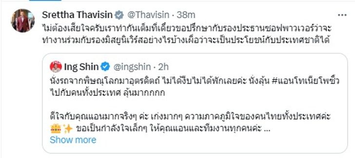 ขณะที่ นายเศรษฐา ทวีสิน ก็ได้มาโควทข้อความดังกล่าว พร้อมระบุว่า “ไม่ต้องเสียใจครับเราทำกันเต็มที่เดี๋ยวขอปรึกษากับรองประธานซอฟต์พาวเวอร์ว่าจะทำงานร่วมกับรองมิสยูนิเวิร์สอย่างไรบ้างเผื่อว่าจะเป็นประโยชน์กับประเทศชาติได้”